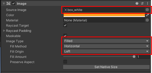 Source Image에 반드시 Sprite를 넣어줘야 Image Tpye을 사용하여 fillAmount를 사용할 수 있습니다. 원하는 이미지를 넣어서 게이지 바를 표시하고 만약 기본적인 네모 형태를 원하시면 아래 작은 이미지를 다운받아서 넣으시면 됩니다.