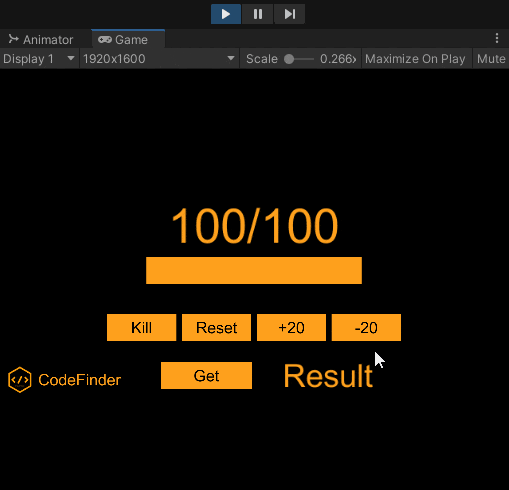이번 예시는 체력바 예시입니다. Kill 버튼을 눌러서 체력을 0으로 만들거나 Reset 버튼을 눌러 체력을 초기화할 수 있습니다. +20, -20 버튼으로 체력을 조절할 수 있습니다. Get 버튼을 누르면 현재 체력을 가져와서 표시합니다.