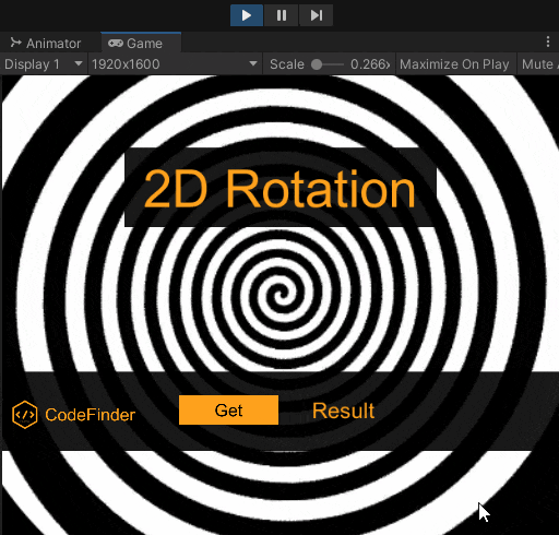 화면 전체 크기의 나선형 2D 이미지가 z 축으로 -2 속도로 돌아가는 예시입니다. Get 버튼을 누르면 현재 회전 값 z를 반환합니다.